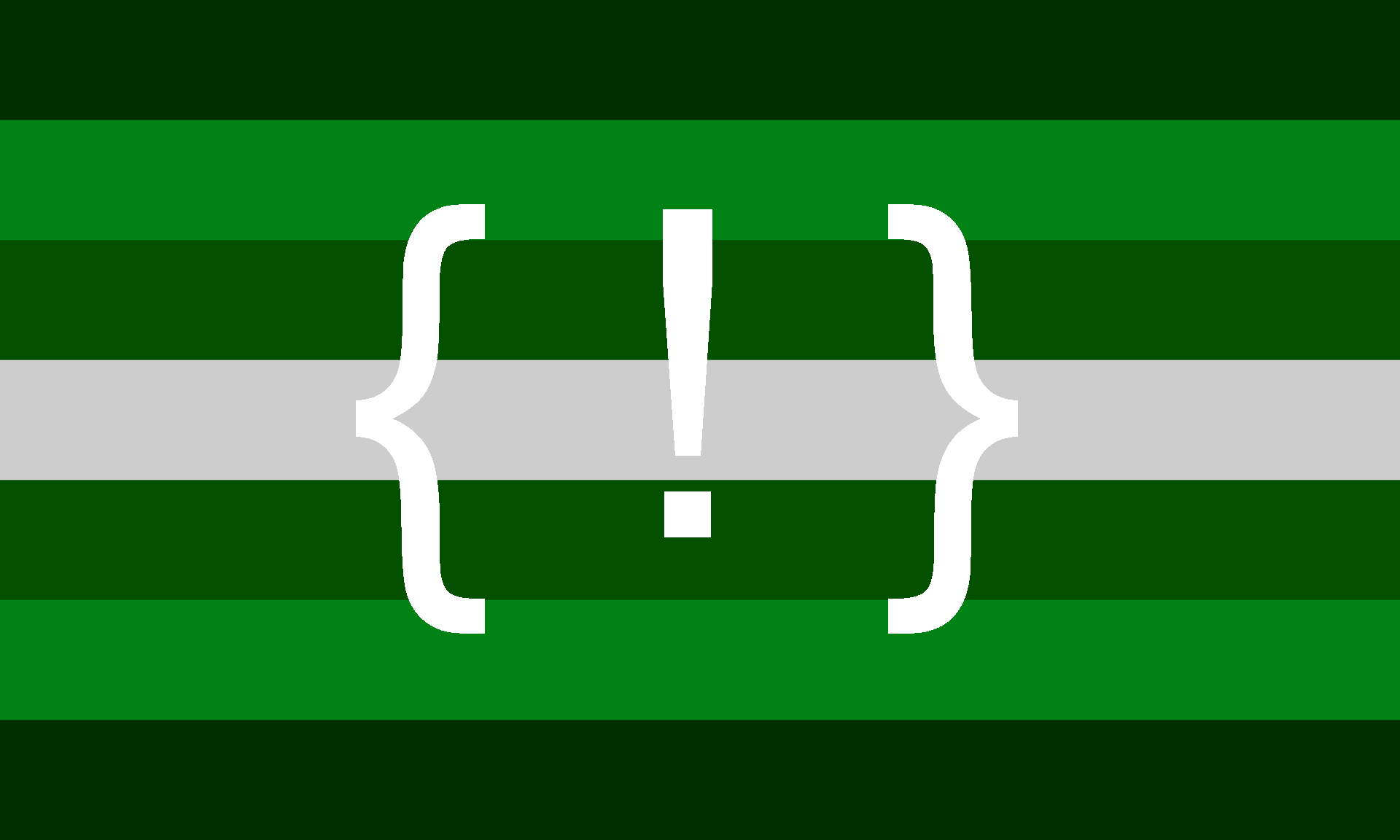 The flag's colors are both related to code and agenderedness, and the symbol wrapping squiggly-brackets around an exclamation point is in reference to the programming aspect of the gender.[1]