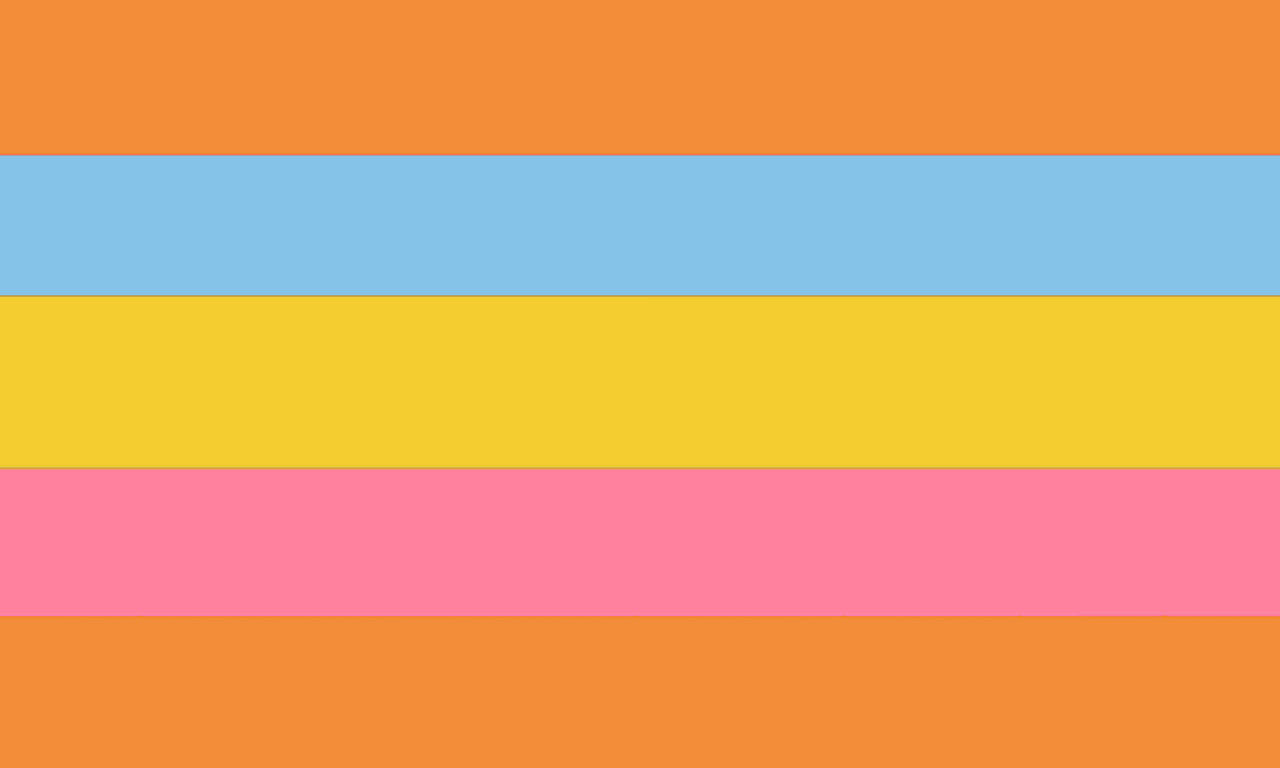 The first alternate flag was designed by Fandom user Felix.guchi. on June 13, 2021.[2] On this flag, the orange represents the fluidity of gender, the blue signifies masculinity and masculine genders, the yellow is to represent discomfort, and the pink is to represent femininity and feminine genders.
