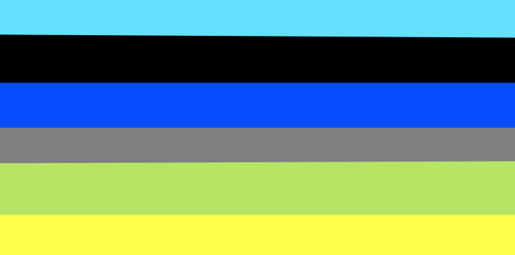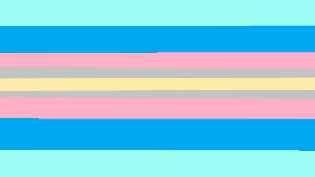 The second alternate flag was designed by Fandom user Koudvuur on June 14, 2021.[3] Light blue represents fluidity of gender, the blue signifies masculine genders, the pink represents feminine genders, the gray signifies non-binary genders, and the yellow is to represent discomfort.