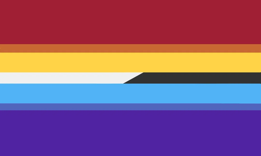 Both angologygender flags were designed by Reddit user BloodMoon_Night on September 4, 2021.[1] On the flag, the color meanings are as follows, from top to bottom: dark red, demonic aesthetics; orange, separation from "pure good" and "pure evil"; yellow, angelic aesthetics; black/white, an understanding of (and disconnection from) humanity; teal, connection to angels in media; pale blue, separation from religion; and dark blue, connection to demons in media.