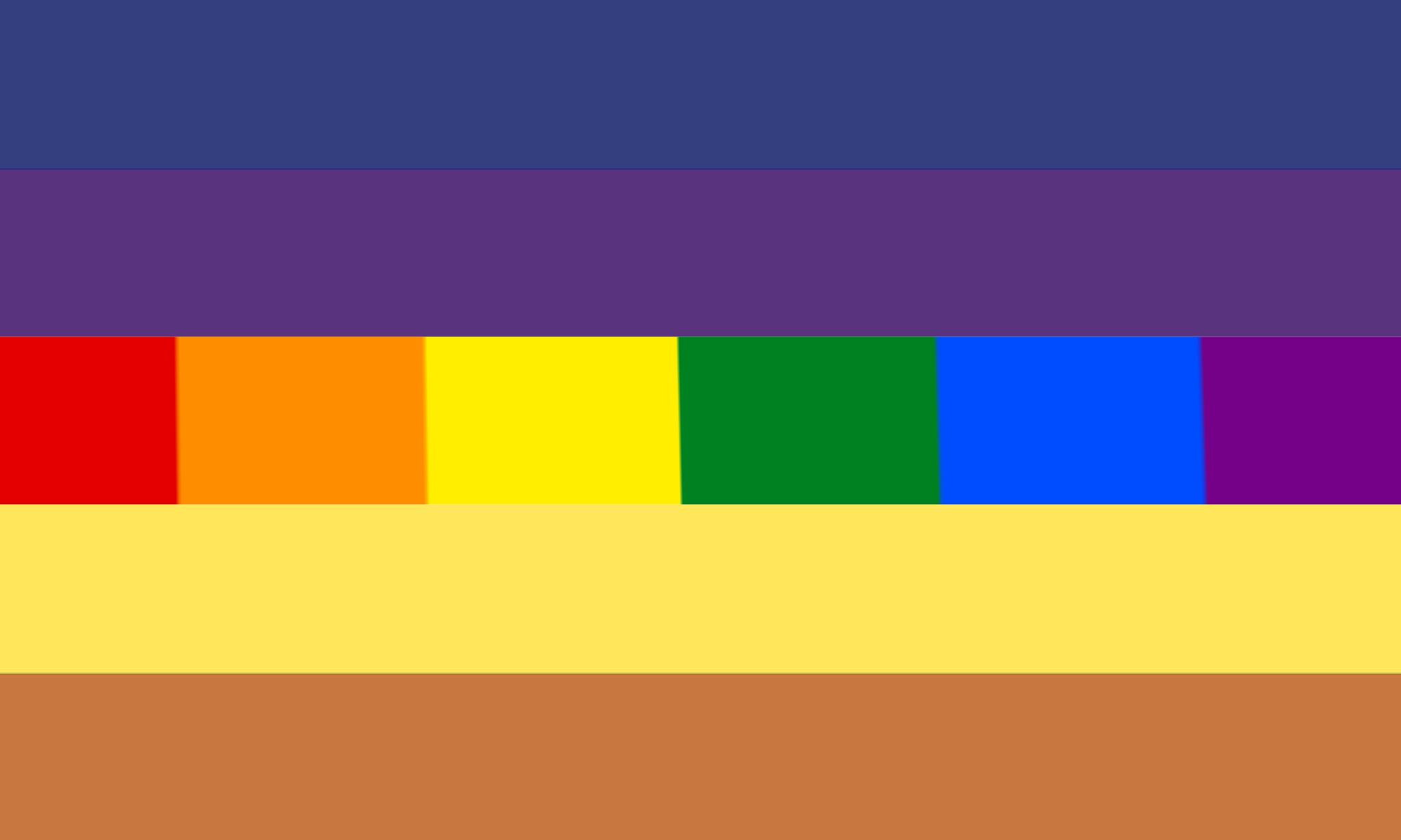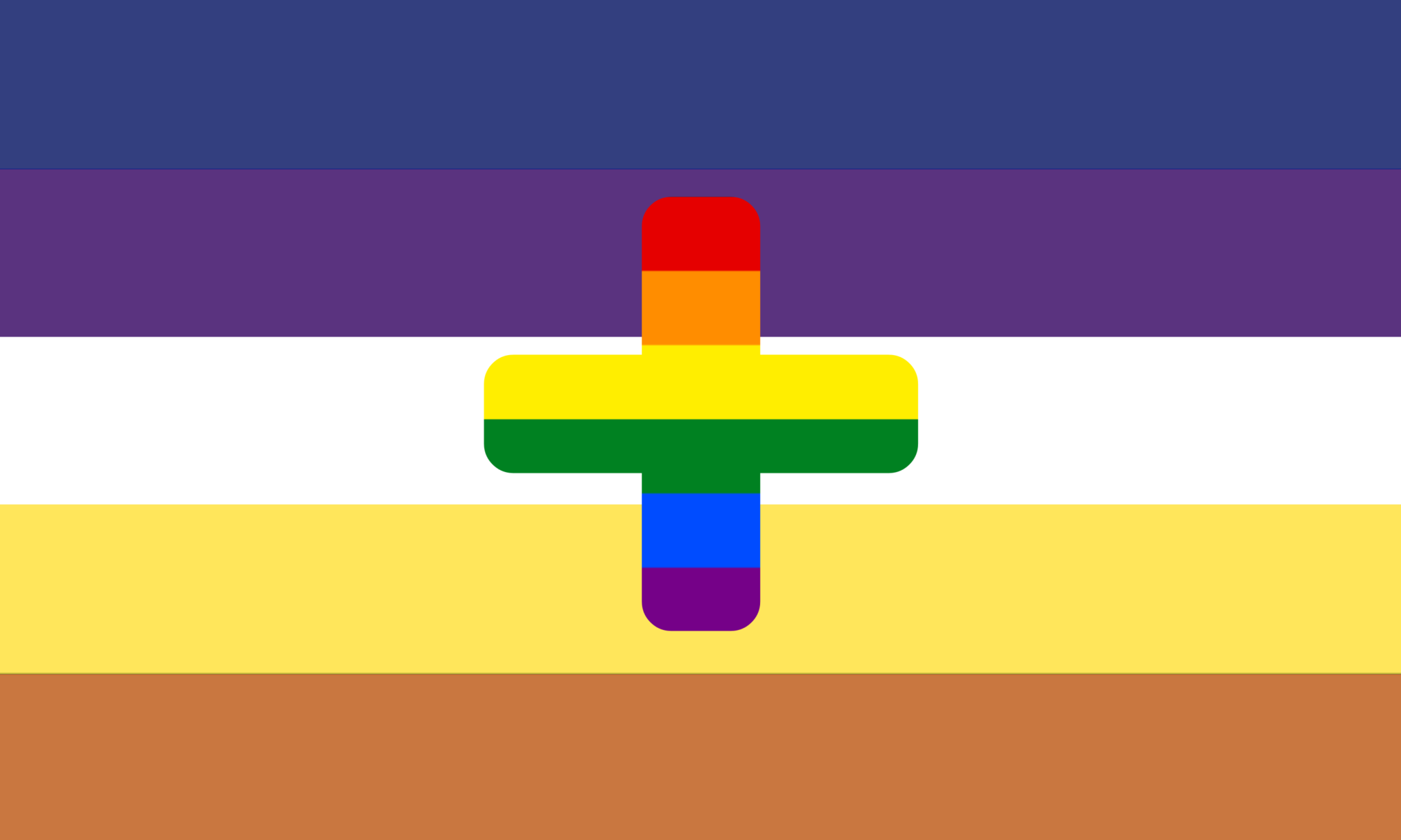 The boyhoard flags were designed by Fandom user SlayerSeslyn. The dark blue stripe at the top represents masculinity or other masculine genders. The dark purple stripe below represents non-binary identities. The white stripe at the center represents a lack of gender. The yellow stripe below represents demigender identities. And the light brown stripe at the bottom represents genderfluidity. In the main and third versions of the flag, the rainbow stripe/plus sign represents the rest of the million other gender identities one might include as a boyhoard person.