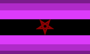The devilgender flag was created by Fandom user Boredomisdead on December 13th, 2020.[1] It has a total of seven stripes. The purple stripes represent evil, black represents mystery, and the pentagram is a common symbol in Satanism. The flag was rotated 180 degrees by Fandom user VoidwyrmGaming because the pentagram was upside down,[1] and it was then edited into a higher resolution by Tumblr user digicoinz on May 21, 2021.[2]