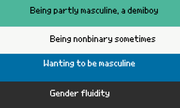 | “ | dosuboy having a fluid gender were they are not always a masculine gender but they want to be masculine | ” |