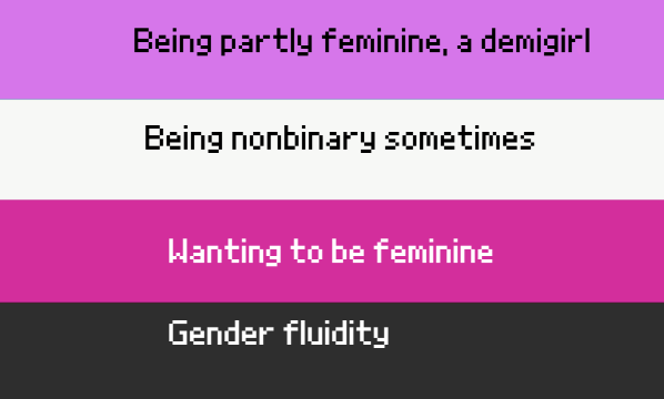| “ | dosugirl having a fluid gender were they are not always a feminine gender but they want to be feminine | ” |