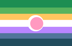 The green shades represent agenrine identities, yellow represents identities outside of the male to female spectrum, purple represents genders that are androgynous in nature, blue represents masculine and male genders, pink represents female and feminine genders, and lastly, the white band and sphere represent the gender (or genders) that's the main focus of one's identity.