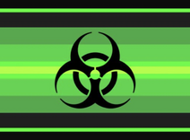 The flag was designed by bored-coiner on the same day. The flag consists of black stripes on the top and bottom with some thin green stripes, tints of green stripes, and a giant biohazard symbol on the center.