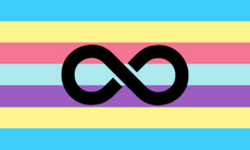 The alternate flag was created by Tumblr user synpa-tee on June 6, 2021.[2] The three center stripes, pink, blue, and purple in descending order, come from the neurogender flag, but they have been lightened. The outer stripes, yellow and blue on the top and bottom of the center three, come from the genderflux flag. The black infinity symbol in the center represents neurodivergency.