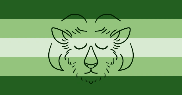 The flag is a five-striped flag that has two dark green stripes, one on top, one on bottom, two light green stripes, and one white-ish stripe in the middle. It has a small drawing of a satyr as it's icon. The dark green represents forests, the light green represents grass, and the white-ish represents sun.