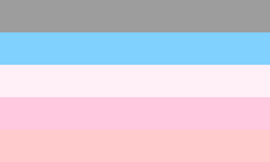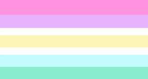 Another alternate sanriogender flag was created on August 11, 2020, by Twitter user Irlkel_.[2] Pink represents the connection to femininity, purple represents fluctuating aesthetic fixations, white represents neurodivergence, yellow represents gender nonconformity, blue represents a connection to soft fabrics and aesthetics, and green represents a connection to animals.